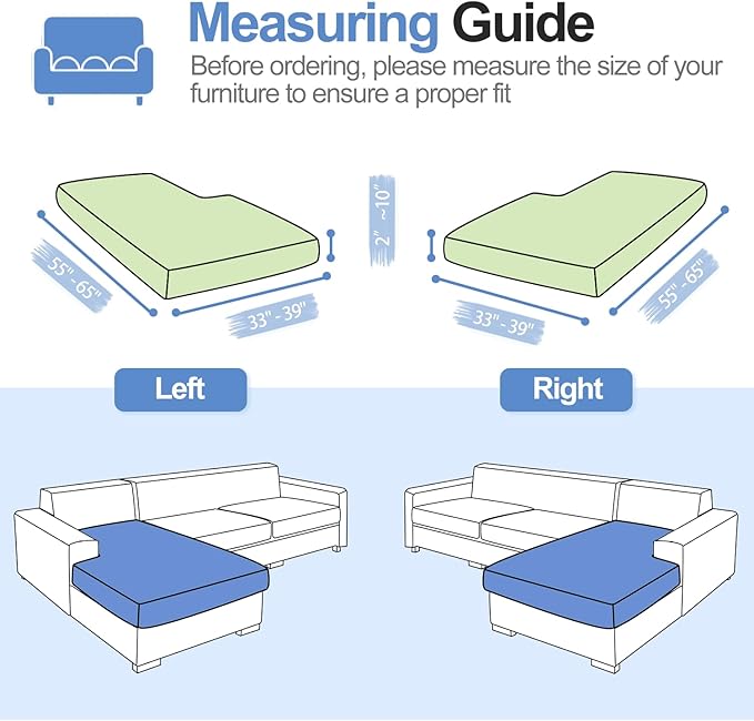 - 【Easy to install】This chaise couch cover is effortless to install and can be completed in just a few minutes. It includes elastic bands that securely fix the cover to the sofa, keeping it in the correct position. Please ensure to measure the size of your furniture before ordering to ensure a proper fit. This cover is suitable for T-cushion and Box cushion styles and is highly recommended for use with both leather and fabric furniture.