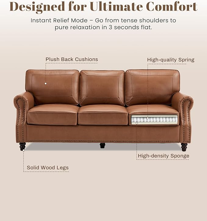 - Traditional Retro Style: The sofa has a sophisticated design with a luxurious look, hand-inlaid nailhead trim is elegant and eye-catching, and the classic rolled armrests provide comfortable support. This 3 seater leather sofa blends traditional vintage with modern chic, and will complement living room, apartment, office and other lounge areas perfectly.