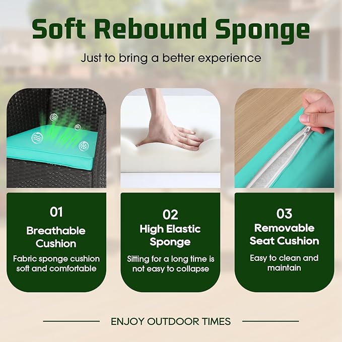 - COMFORTABLE & STYLISH DESIGN: This patio set has thick, high-density rebound sponge cushions for cozy seating. Its simple, stylish look suits patios, balconies, poolside, or gardens.