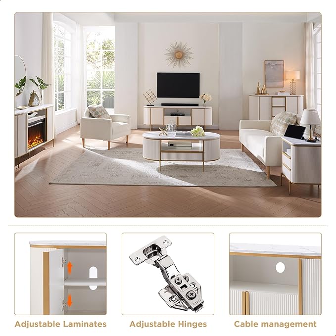 - 70 "LARGE LUXURY TV STAND: The distinctive wave-like fluted panel and Curved Profile Design makes it can be effortless paired with other modern furniture styles. The white/dark blue faux marble top replicates natural marble patterns, maintaining a sense of luxury while reducing weight. Golden metal accents add a touch of visual opulence, and the warm golden tones bring a cozy atmosphere to the room, making it your ideal modern luxury piece for the living room.
