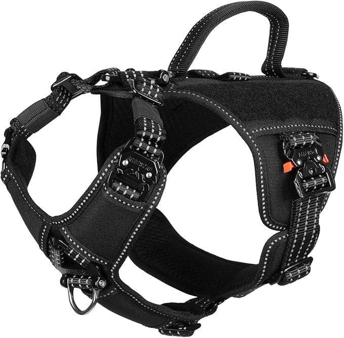 - [Mobility and Convenience ]:This dog vest features maximum cut at the rear of the front legs and armpit areas, providing your dog with the greatest mobility during running, walking, training, or other outdoor activities,it is equipped with 4 quick-release buckles, allowing you to easily and quickly put on or take off the vest for your dog without causing any discomfort
