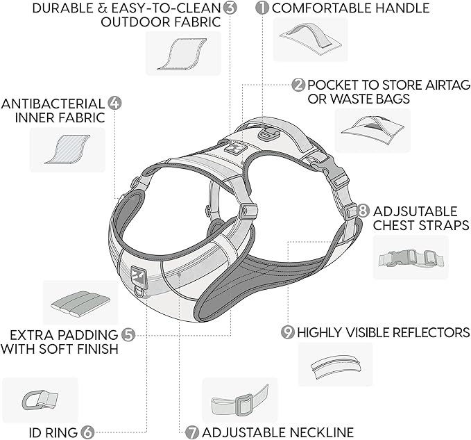 - Ease of Use: Built with 4 points of adjustments, it can easily be tailored for a snug and secure fit. Avoid the hassle of putting it on and taking it off by using the clip buckles on the chest straps. Be ready to go in seconds. Additionally, an innovative integrated pocket is designed for storing essentials like Air tags or waste bags, so you’re always prepared during your walks.