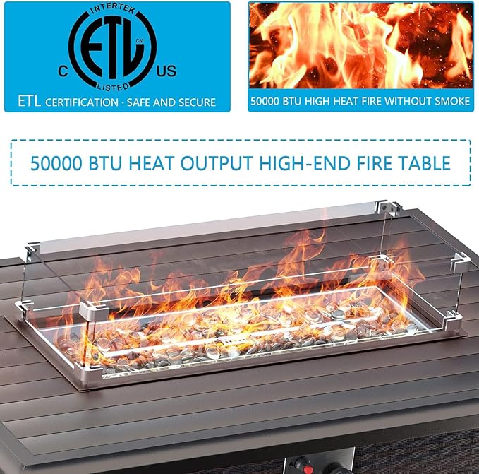 - Fire Pit Table: This rattan propane fire pit table can be used as a dining table when covered with the metal lid. The gas stove table features ETL safety certification and a maximum heat output of 50,000 BTU. The flame can be easily adjusted via the knob after ignition. Crafted with rust-resistant aluminum tabletop and durable stainless steel fire pan and burner tubes. Includes glass cover, glass stones, and black protective table cover. (Propane Tank Not Included)