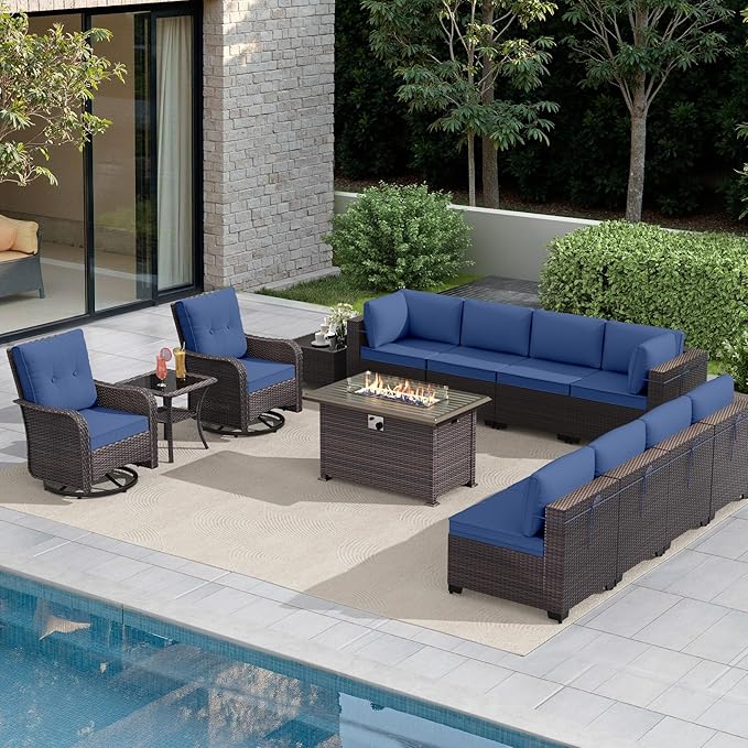 Gotland 13 Pieces Patio Furniture Set with Fire Pit Table Swivel Chairs, PE Rattan Outdoor Furniture Set with 29.5'' High Backrest 4’’ Thick Cushions Coffee Table, Patio Set for Porch, Deck, Navy