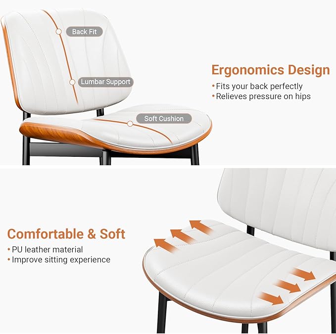 Dining Chairs Set of 6, Dining Room and Kitchen Chairs, FSC Certified Mid Century Modern Accent Chair, Upholstered PU Leather Chairs for Vanity with Walnut Bentwood and Metal Legs, White