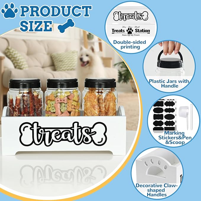 - 【A Must Have for Your Furry Friend】Our all-in-one dog treat container set includes 3 large food-grade plastic jars with handle and a dog food container holder. So this cat food container doesn't take up much space but holds a decent amount of treats. The dog treat jar comes with stickers so you can write on. Having a dedicated pet food storage container helps prevent overfeeding, promoting a healthier lifestyle for your pet.
