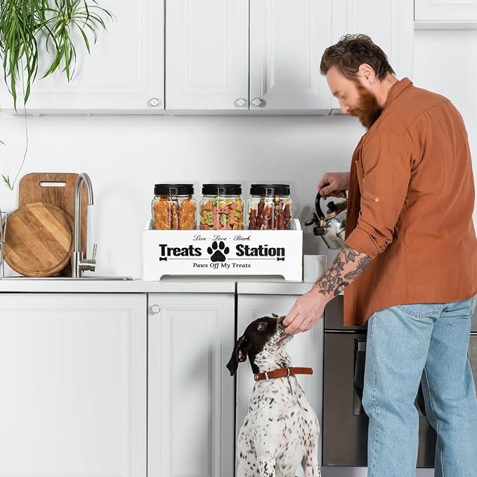 Dog Treat Container Dog Food Container for Dog Food Storage, Farmhouse Cat Food Container Pet Food Storage Organizer, Wood Dog Treat Holder with 3 Plastic Cat Dog Treat Jars, White Cat Treat Container