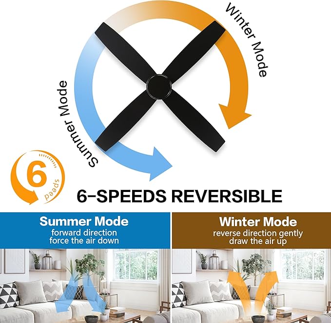 - QUIET & REVERSIBLE: The powerful ceiling fan operates on 6 forward and reverse speeds (easy to adjust with the included handheld remote). Change the direction from downdraft mode during the summer to updraft mode during the winter.