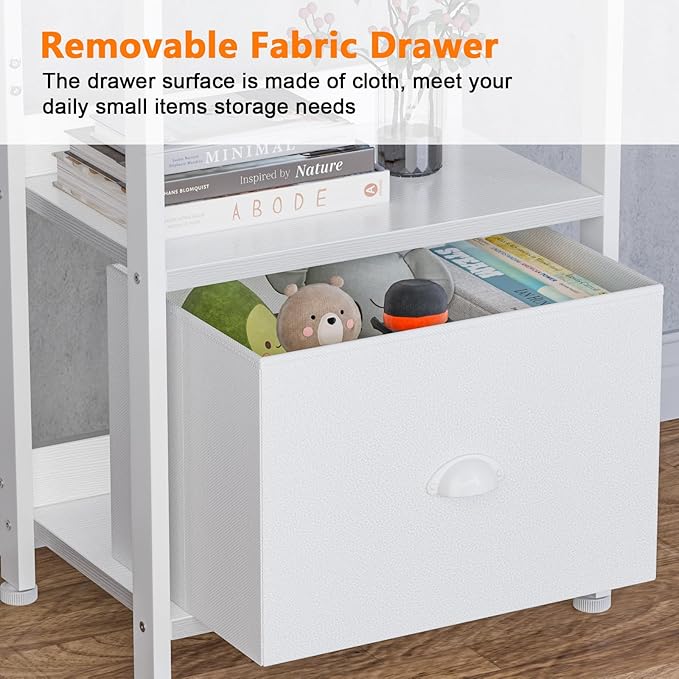 - [Bookshelves with Removable Fabric Drawer]: This white skinny bookshelf with a drawer, and the surface is made of cloth, which is light and soft. This design adds security, so it is suitable for use in the nursery or kids room. Drawer size is 13.7"W x 10.2" D x 10.2"H, same as a small storage box, can be placed anywhere, closet for storage as you like!
