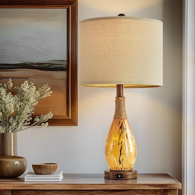 - For Your Loved One: Unique glass table lamps, linen fabric lampshades and high-quality resin wood lamp holders add a romantic and warm atmosphere to your living room, rattan wrapped design on the modern table lamp holder and the glass lamp body of the drip-shaped built-in nightlight make the lamp even more unique.