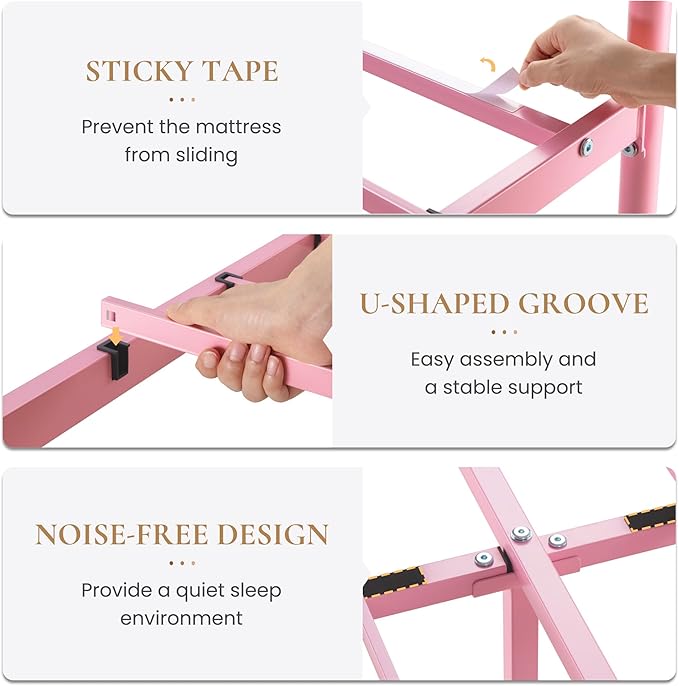 - Noise-Free: The pink bed frame provides an EVA sponge to help cushion the contact between slats and reduce potential noise caused by friction. Greatly improve the quality of sleep by minimizing disturbances from creaking or rattling sounds