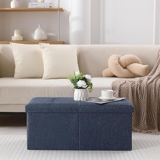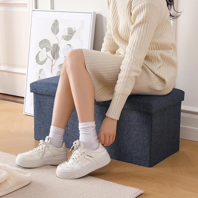 CUYOCA Storage Ottoman Bench Foldable Seat Footrest Shoe Bench End of Bed Storage with Flipping Lid, 75L Storage Space, 30 inches Linen Fabric Navy