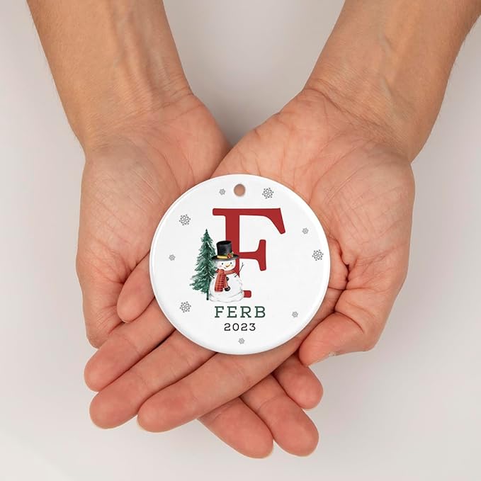 Andaz Press Personalized Ornament, Custom Name, Initial F Monogram Snowman 2.8" Ceramic Porcelain 2025 Christmas Ornament Keepsake for Kids, Boys, Girls, Includes Gold Ribbon & Gift Box, 1-Pack