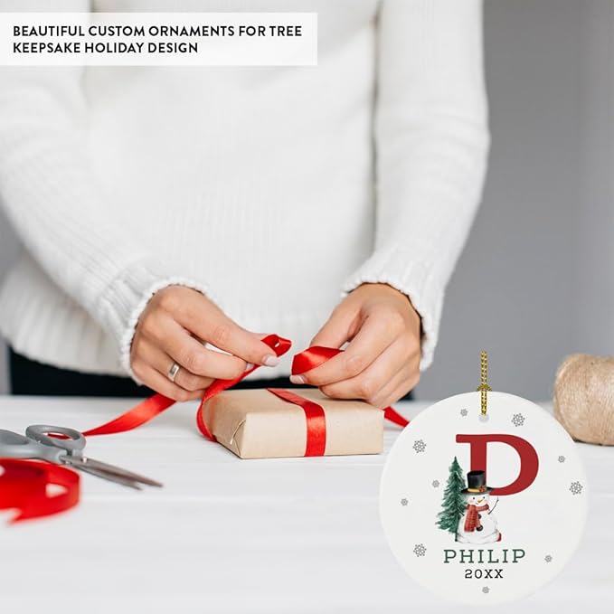 Andaz Press Personalized Ornament, Custom Name, Initial P Monogram Snowman 2.8" Ceramic Porcelain 2025 Christmas Ornament Keepsake for Kids, Boys, Girls, Includes Gold Ribbon & Gift Box, 1-Pack