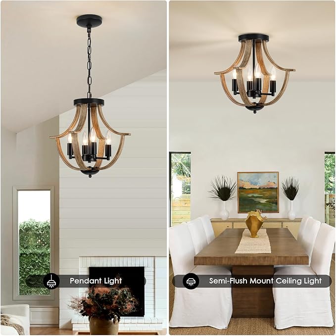 - 【Vintage Farmhouse Design】Farmhouse Chandeliers for Dining Room Light Fixture, 4-Light Rustic Flush Mount Ceiling Light, Wood Texture Pendant Lighting Fixtures for Living Room Kitchen Island Foyer Entryway This farmhouse chandelier for the dining room features a unique hand brushed faux wood grain color and black finish.