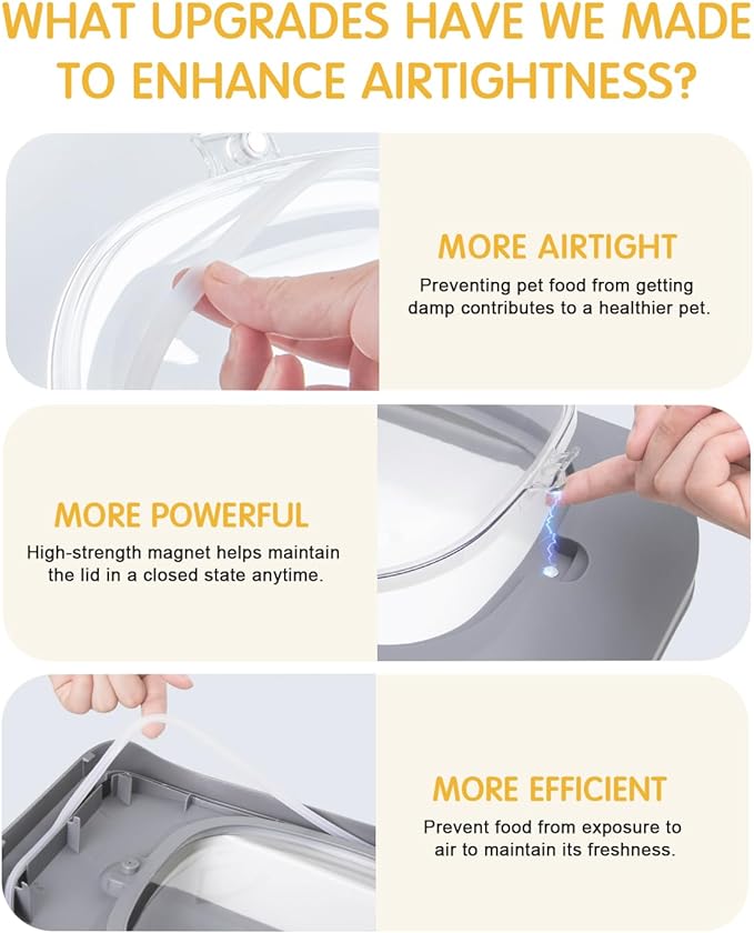 - MOISTURE-PROOF: Airtight dog food storage container, the bottom slightly elevated design allows the dry food away from wet ground to ensure that the pet fresh food is available.(Tips:when you close the small dog food containers' transparent lid, please make sure it is completely closed with no space)