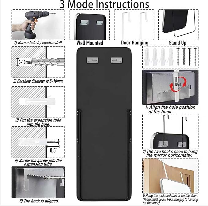- Easy to install(3 Way): 1)Door:Hanging on back door with hooks(Text close door slowly); 2)Wall:Install the expansion screws (contained in the package) into two drilled holes, and then hang the mirror on the screws;3)Standing: Stand on floor by back stand