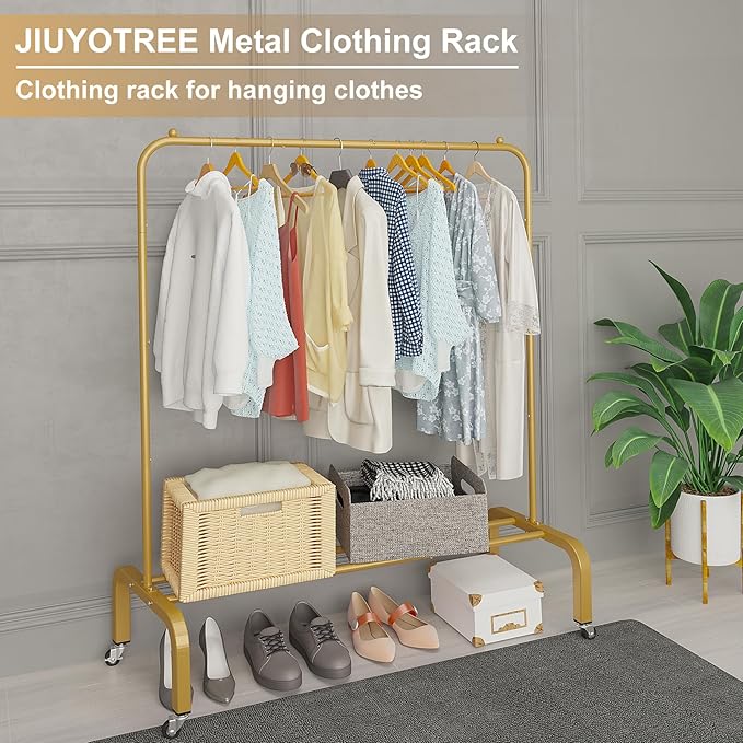 JIUYOTREE Metal Clothing Rack with Wheels 43.3 Inches Rolling Clothes Garment Coat Rack with Bottom Shelf Clothing Rack for Hanging Clothes Coats Skirts Shirts Sweaters Gold