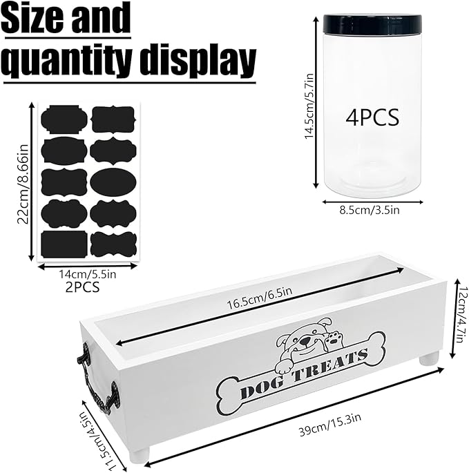- Super Capacity Treats Storage Container: Our dog food storage container measures 15.3 inches (L) x 4.5 inches (W) x 4.7 inches (H), which is equipped with 4 high capacity food plastic jars and 20 blank labels, enough number of food plastic jars can satisfy your daily needs, and the blank labels can be well categorized to store a variety of pet-friendly snacks, such as dog food, cat food, snacks or cookies.
