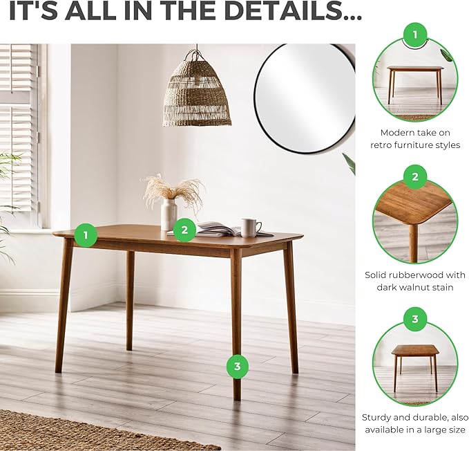 - MODERN TAKE ON TRADITIONAL DINING FURNITURE STYLES: the Lynton dark wood dining table is a gorgeous modern take on more traditional classic dining furniture. Comfortably seats 4, so great for smaller families or entertaining guests. Solid wood with a dark walnut stain gives this seat a lovely warm look. The design has a slight mid-century retro feel with the mildly angled legs but is brought up to date with the simple straight lines. This wood dining table will look fab in a range of home styles