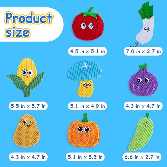- 【8 Pack No Stuffing Dog Toys】8 pack dog toys set include multiple squeakers, your furry friend will crazy about it! Newest styles (Corn, Pumpkin, Potato, Scallion, Onion, Tomato, Mushroom, Pea) different from other similar no stuffing dog toys. And we specially choose the artificial rabbit plush/corduroy which is soft and durable.Your pet deserves the best!