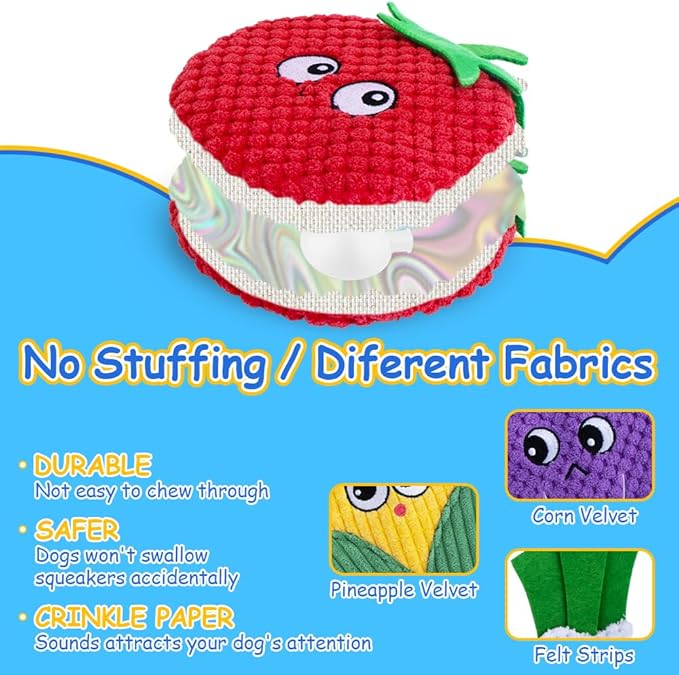 - 【Crinkle & Squeaky Dog Toys】When your dog bites or presses the soft dog toy, the built-in squeaker could make a sound. This sound will stimulate the dog's curiosity, and your dog will always explore it. Besides, there is hard-to-resist crinkle paper. It adds an extra level of sensory stimulation for your dog, providing a fun and engaging playtime experience. Attract your dog's attention and keep it busy all day long. These funny dog toys are always your dog's friend!