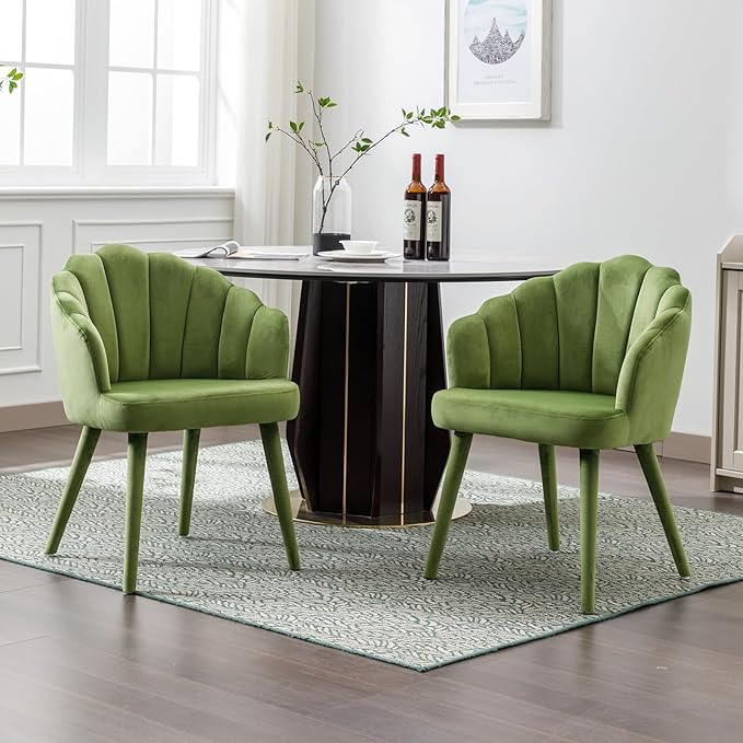 Velvet Dining Chairs Set of 2 Modern Living Room Chairs with Petal Back & Wood Legs Comfy Upholstered Side Chair for Dining Room/Bedroom/Vanity, Olive