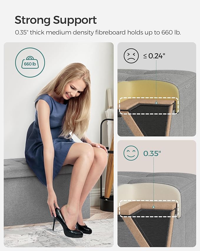 - 【STURDY AND DURABLE】Built with premium MDF panels and reinforced with metal corner guards on the lid, this ottoman is strong enough to support up to 660 lb (300 kg), making it a reliable seating or storage solution that will stand the test of time