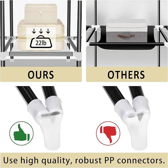 - [Sturdy Structure]:portable wardrobe closet Use reinforced PP plastic connectors to connect steel pipes. The diameter of the strong steel pipe is 19MM Thickness 0.32MM, ensuring the stability of the wardrobe. Don't worry about it collapsing or tilting.