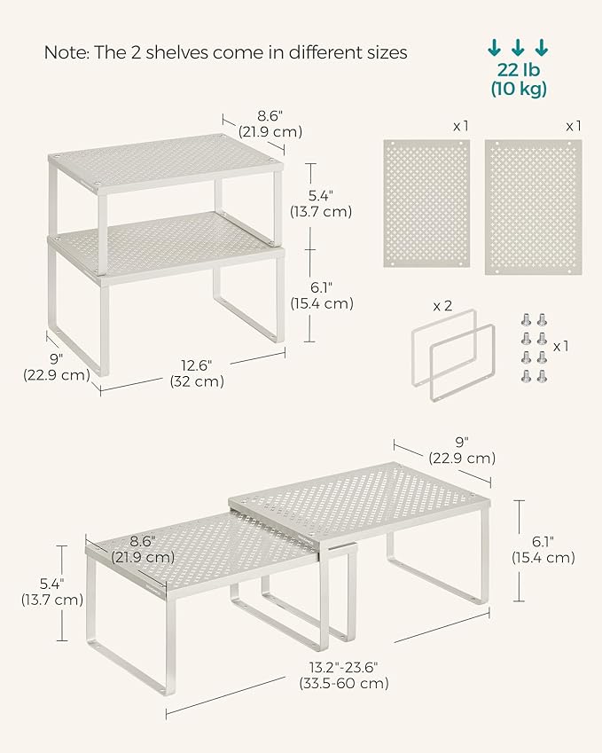 - [What You Get] 2 sturdy cabinet organizers (large shelf: 9"D x 12.6"W x 6.1"H; small shelf: 8.6"D x 12.6"W x 5.4"H) feature an easy-to-clean surface and strength to support heavy loads, maximizing the use of vertical space in your counter or cabinet