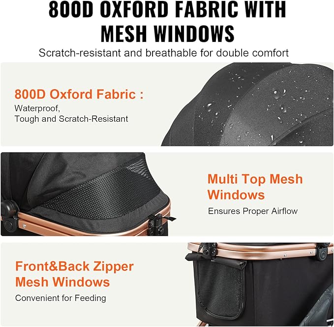 - 800D Oxford Fabric and Mesh Windows: The sturdy 800D Oxford fabric can withstand pet nibbling, keeping the cat stroller in pristine condition. Multiple breathable mesh windows ensure unhindered airflow, providing your pet with a wide field of vision. The button design allows for effortless unfolding.