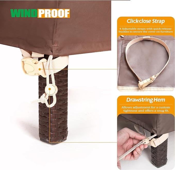 - ADJUSTABLE AND WINDPROOF OUTDOOR TABLE COVER: Adjustable leg straps with buckles for windproof. Drawstring hem for custom tightness and snug fit.