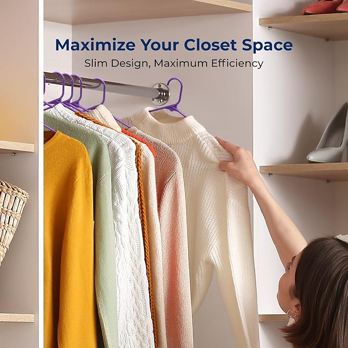 - SPACE SAVER: These plastic hangers are slim and stylish, they maximize your closet space & help your clothes be organized. The non-slip hook design ensures safe hanging of clothes, and the slim, sleek structure maximizes closet space