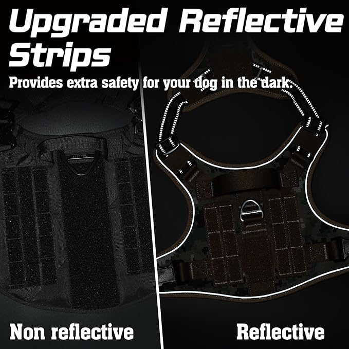 - Ultra Safety Design: The reflective trims all around the tactical dog harness for optimal visibility and security at night. Two secure metal leash attachments for different occasions. Daily back clip for well-trained dog's casual walking or jogging. No-pull front clip helps discourage your dog from pulling