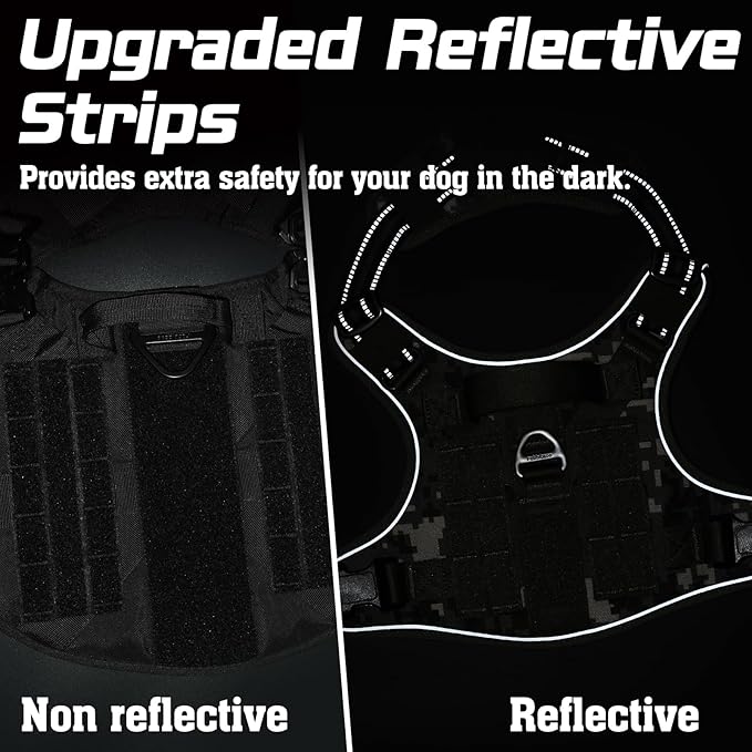 - Ultra Safety Design: The reflective trims all around the tactical dog harness for optimal visibility and security at night. Two secure metal leash attachments for different occasions. Daily back clip for well-trained dog's casual walking or jogging. No-pull front clip helps discourage your dog from pulling