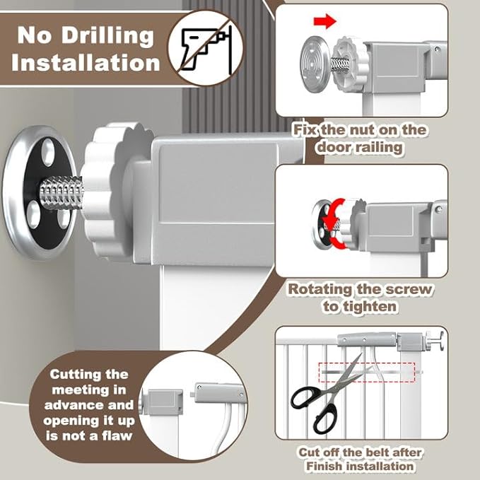 - Easy installation: Installing our pet baby door is effortless.It comes with 4 adjustable pressure bolts for a quick 5-minute installation, no tools or drilling are required, and it won't damage your house walls.There are also several expansion accessories for you to choose the appropriate width