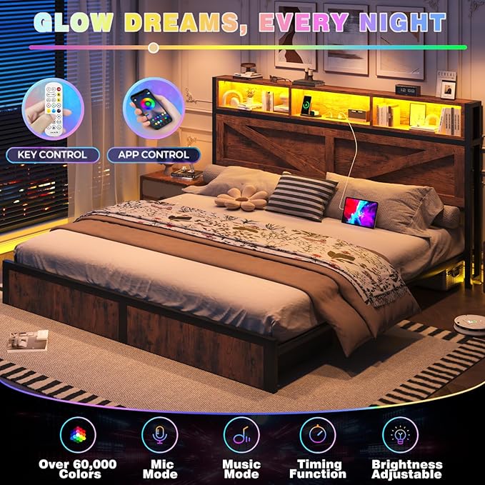 Farmhouse King Bed Frame with Bookcase Storage Headboard, Charging Station, LED Light and 2 Storage Drawers, Noise Free, No Box Spring Needed, Brown