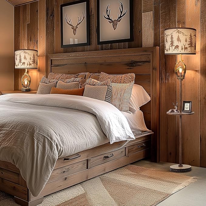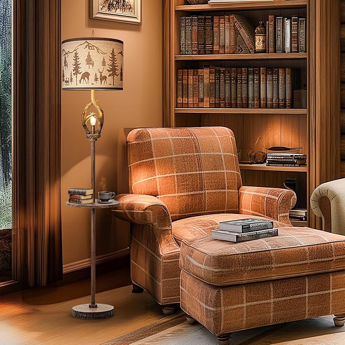 - Size and design: 65 "tall rustic antler floor lamp. 13" X13 "X10" linen fabric lampshade. Natural forest style design complements any home décor in the living room and bedroom