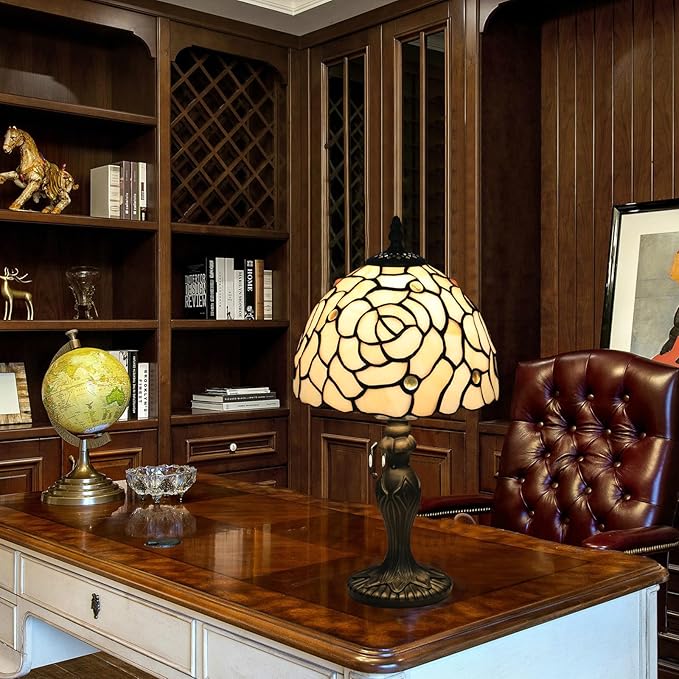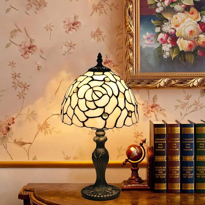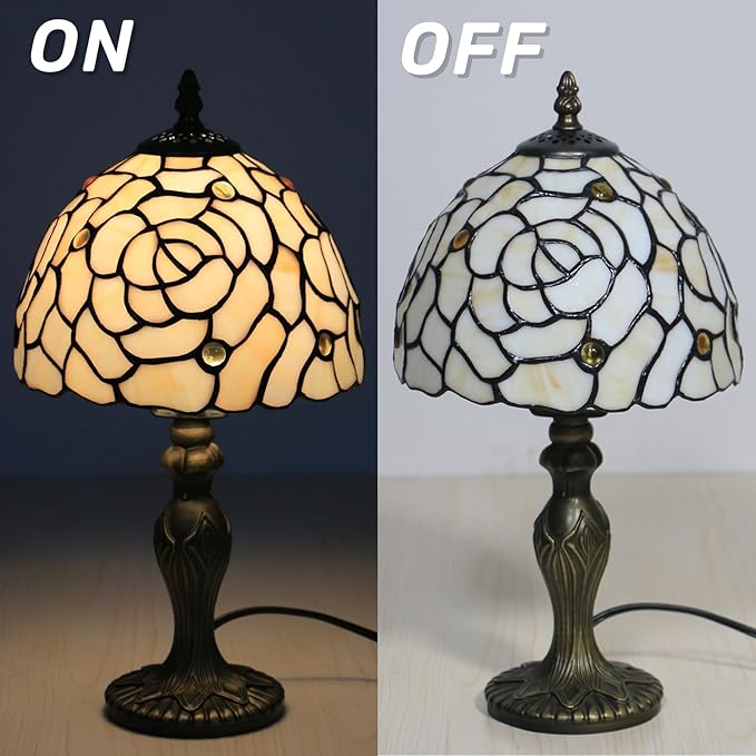 Tiffany Style Small Table Lamp, 8X8X14.5 Inch Rose Stained Glass Lamp, Small Antique Side Table Lamps, Bedside Nightstand Lamp, for Bedroom Living Room Home Office,LED Bulb Include
