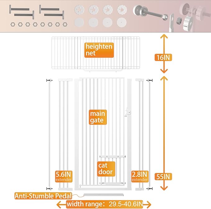 - 【Parts and Accessories】This tall pet gate package with locking cat gate includes 1* 28.85'' main gate, 1* 2.75'' extended gate,4* tension bolts, 4* wall cups, 4* sticky pads, 6* screws, 6* drywall anchors, 1* Anti stumble pedal, 2* installation tools and 1* instruction guide. 2* encryption bar