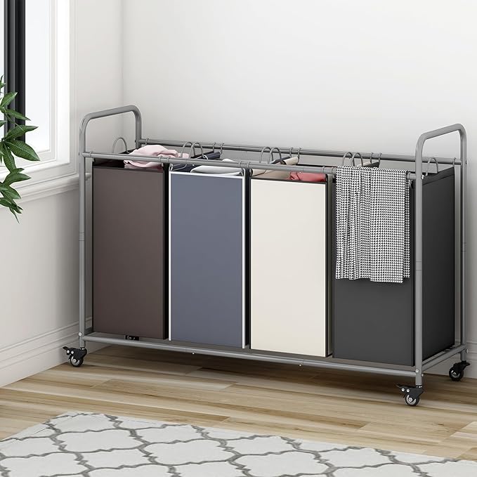 - Rolling Wheel Design: 4 heavy-duty casters allow the laundry sorter cart to move freely; the 2 rolling wheels on the 4-bag laundry sorter can be locked to keep it stationary.