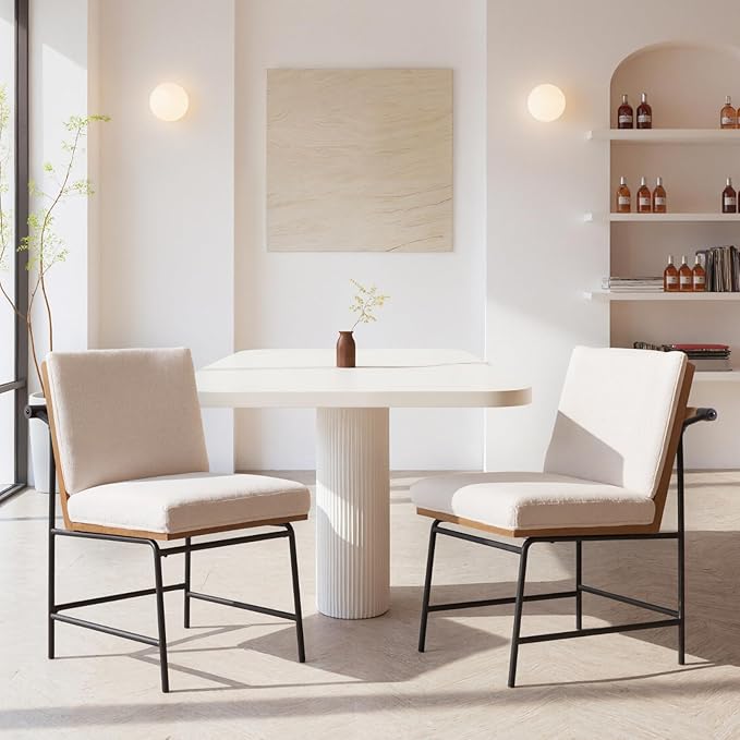 Modern Dining Chairs Set of 2, Comfy Sherpa Fabric Armless Upholstered Side Chairs with Wooden Backrest Black Metal Legs for Dining Room Living Room, White