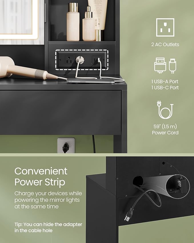 • Customizable Mirror Lighting: Swiftly switch between 3 adjustable LED light colors by shortly tapping the touch button, and set your preferred brightness level with a long press. This vanity table with power outlets enhances your makeup routine every time