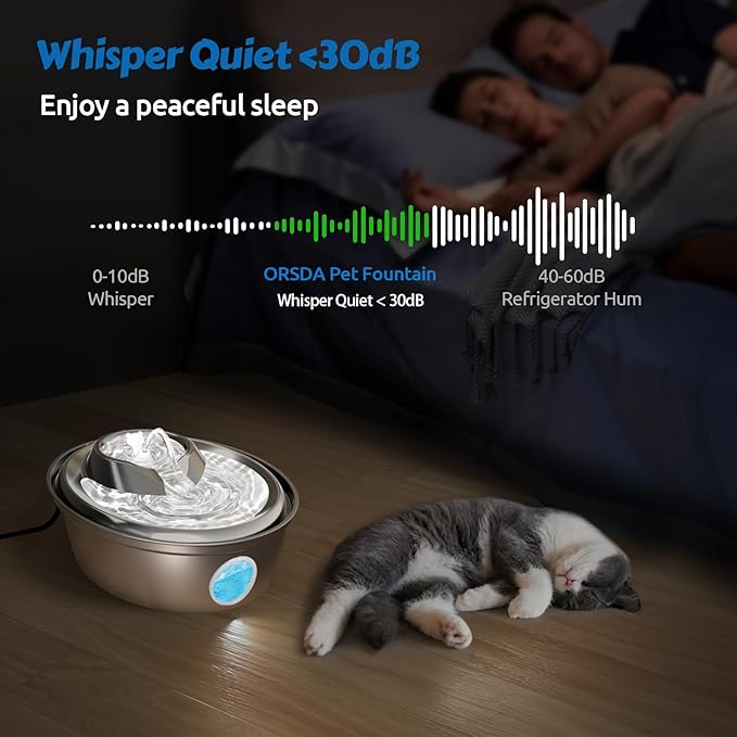 - đ˝ăWhisper-Quiet < 30dBăORSDA D36 2L/67oz pet fountain with upgraded 1W low consumption pump and slope water flow structure, allowing the fountain to operate quiet than 30dB, help you and pets sleep soundly.