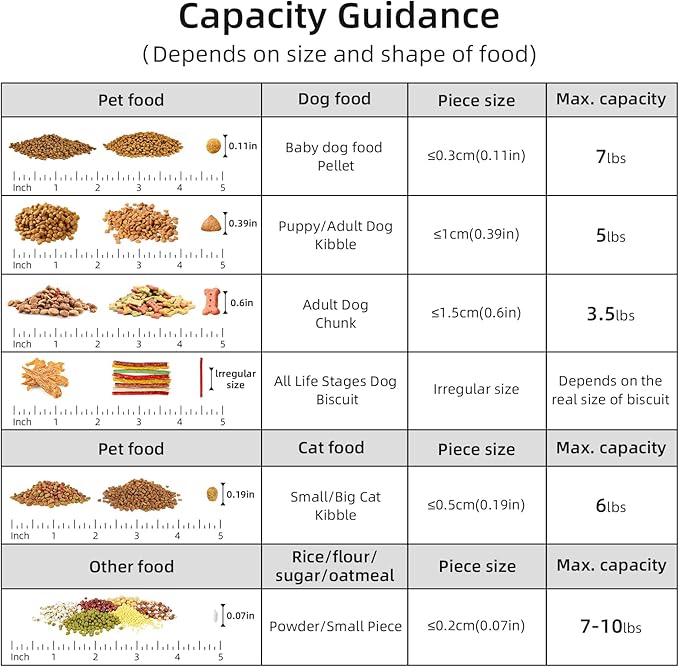 - SUPER LARGE CAPACITY : The airtight cat food container is designed with a large nozzle, so whether it is small or large pieces of food, it can be easily poured out without shaking the barrel. The handle design makes it easy to use and carry indoors and outdoors. It is also convenient to hold with one hand and tip the bucket to pour out food. The size of the pet food container is 14*12*8 inches, with a capacity of 5 liters. It can store pet food for 5 -7LBS, rice, dry food, cereals, etc. is about 10LBS, depending on the size and shape of the food. Can be easily stored and effectively save valuable space whether indoors, outdoors or during travel.