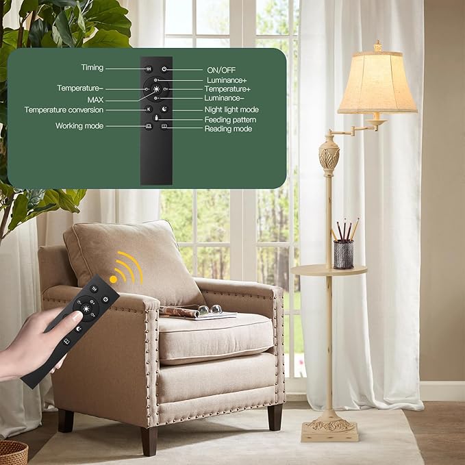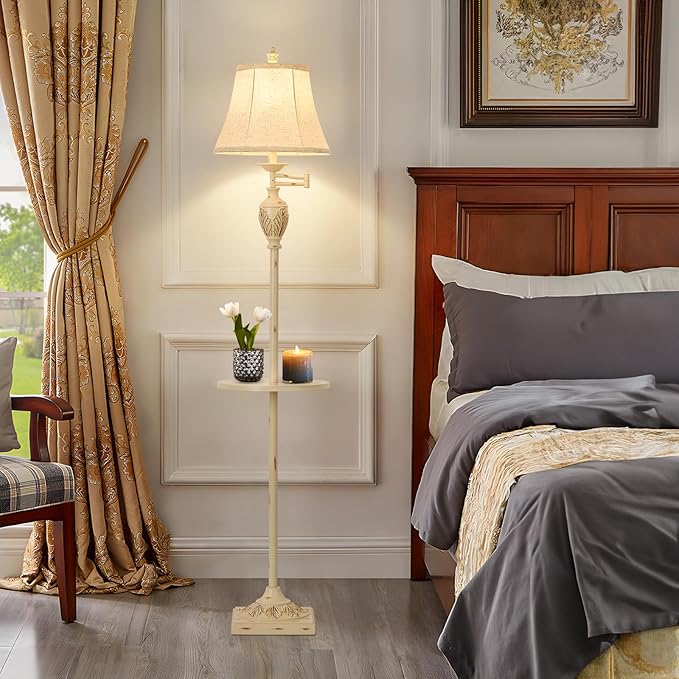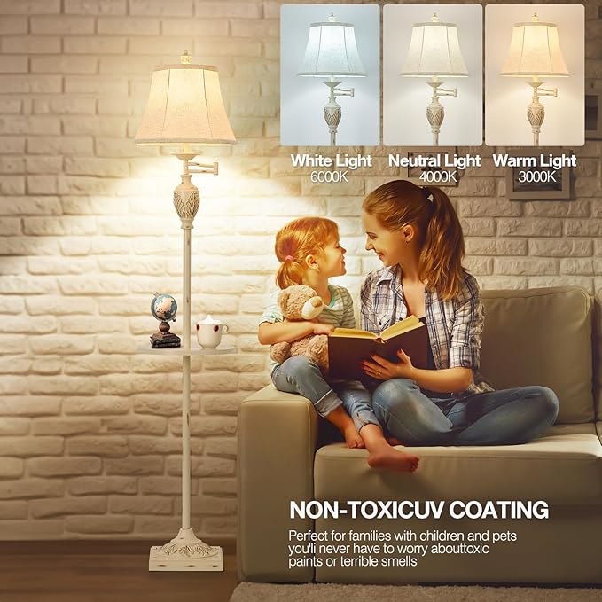- TABLE AND ELEGANT LAMPSHADE-- We upgraded the Lamps,The middle part of the floor lamp has added a tray for you to place your belongings, or put a cup of coffee in the leisure time is also good. The lampshade is made from durable faux silk fabric, which makes the light soft, eye friendly and is easy to clean.