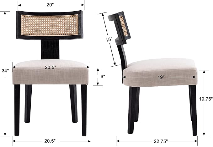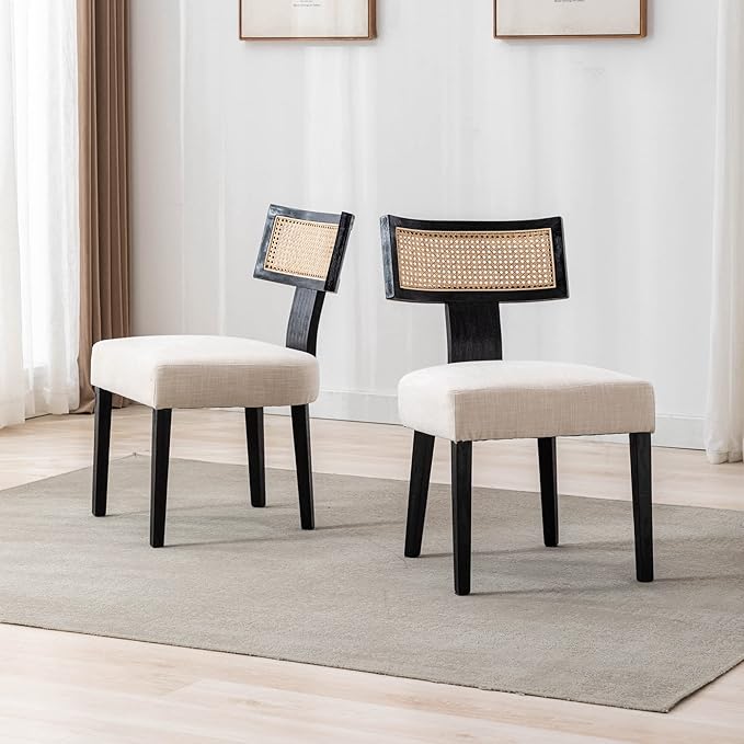 Rattan Dining Chairs Set of 6, Modern Dining Chair Kitchen Dining Room Chair, Curved Cane Back Upholstered Linen Fabric Dining Chair with Black Wood Frame, Beige