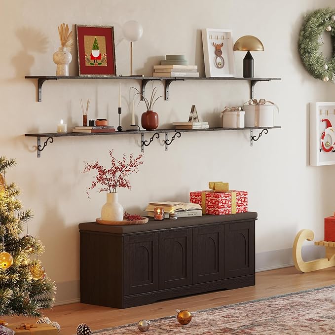 - 【Vintage Charm】Farmhouse design adds a retro-chic vibe to your home. Rusticity wood grain, paired with the elegant and ornate S-shaped iron brackets, flaunts visual charm and vintage. The wall shelves are full of character and enhance the texture of the space. A classy way to display your beloved decorations