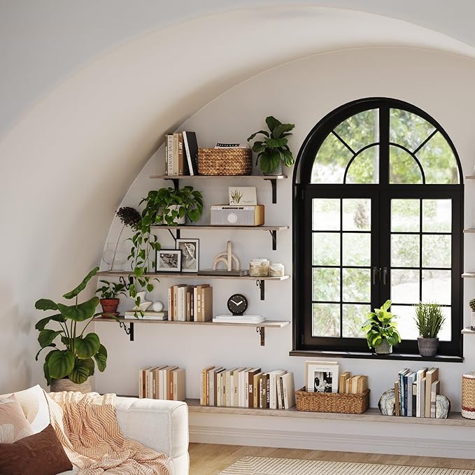 - 【Vintage Charm】Farmhouse design adds a retro-chic vibe to your home. Rusticity wood grain, paired with the elegant and ornate S-shaped iron brackets, flaunts visual charm and vintage. The wall shelves are full of character and enhance the texture of the space. A classy way to display your beloved decorations
