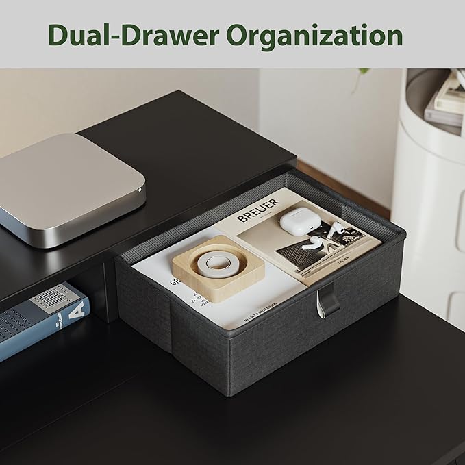 - 【2 Fabric Drawers】The 2 fabric drawers above the desktop can organize your clutter and keep the desktop clean and tidy at all times. The tabletop is made from low-VOC materials and meets federal and state safe air standards.